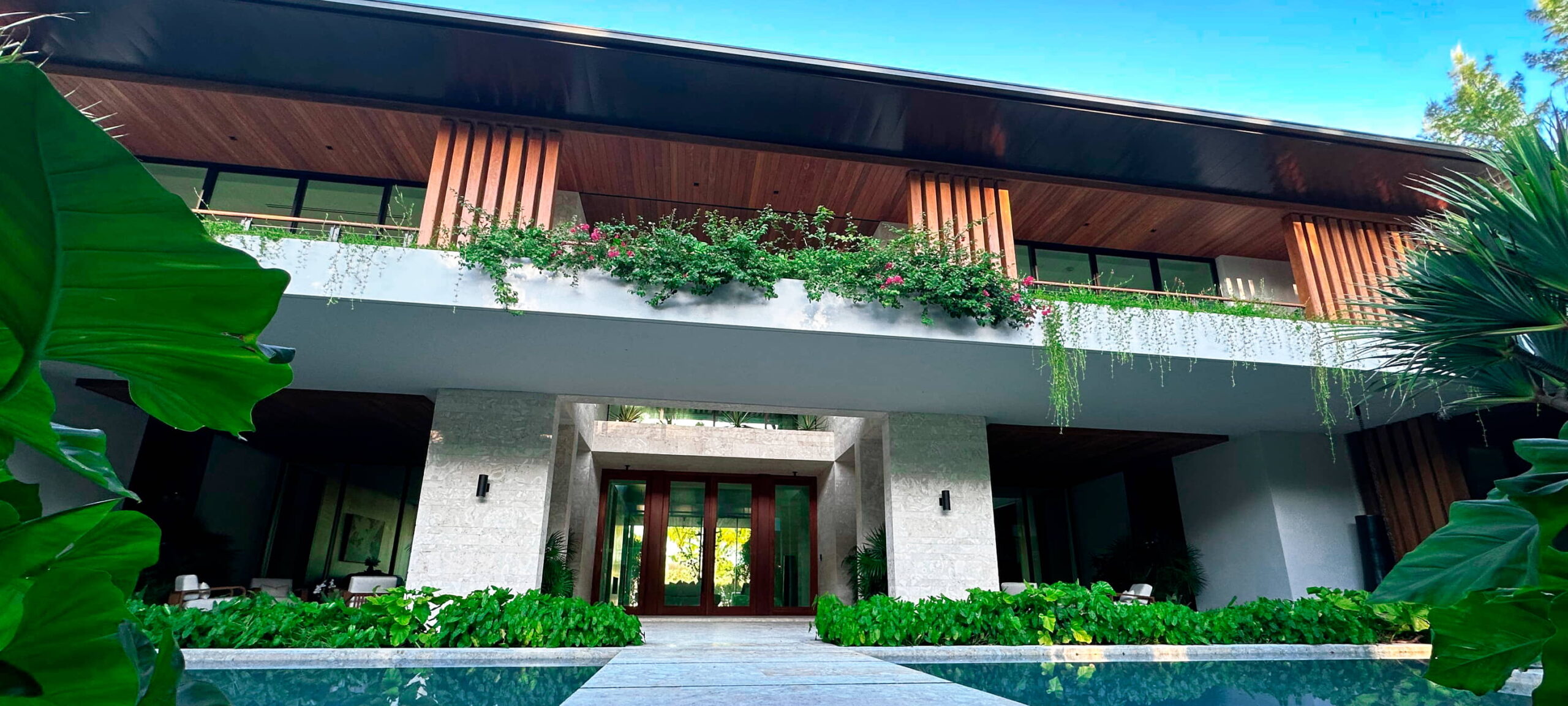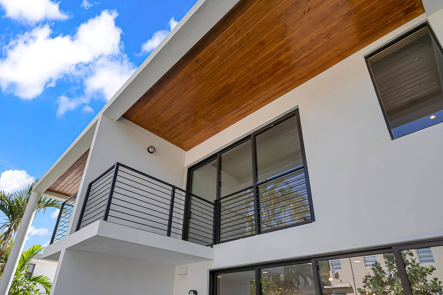The design includes a four‑panel wood‑framed entry door and expansive four‑panel sliding doors that blur indoor‑outdoor boundaries. Elongated fixed windows bring consistent daylight to both levels, complemented by coordinated railing systems that unify balconies and circulation areas. All systems were manufactured under ES Windows specifications for impact resistance, durability, and long‑term performance.